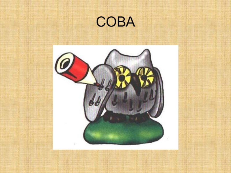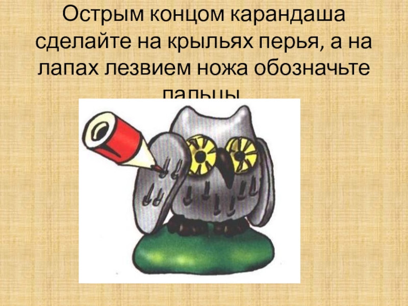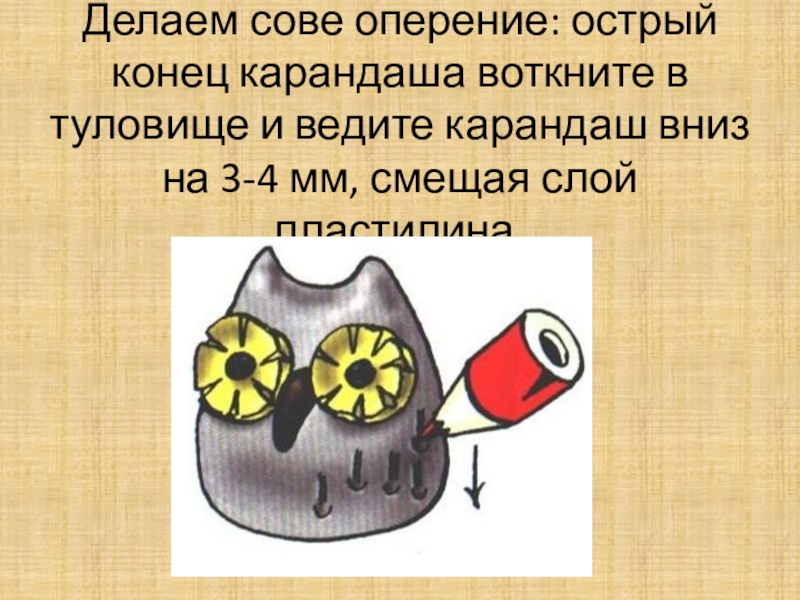Слайд 8Делаем сове оперение: острый конец карандаша воткните в туловище и ведите