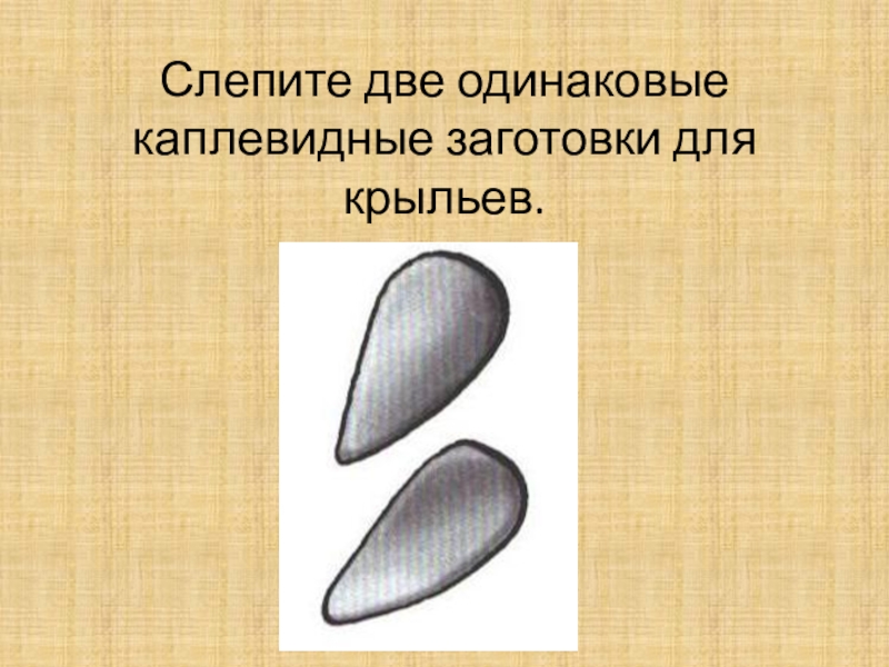Слайд 10Слепите две одинаковые каплевидные заготовки для крыльев.
