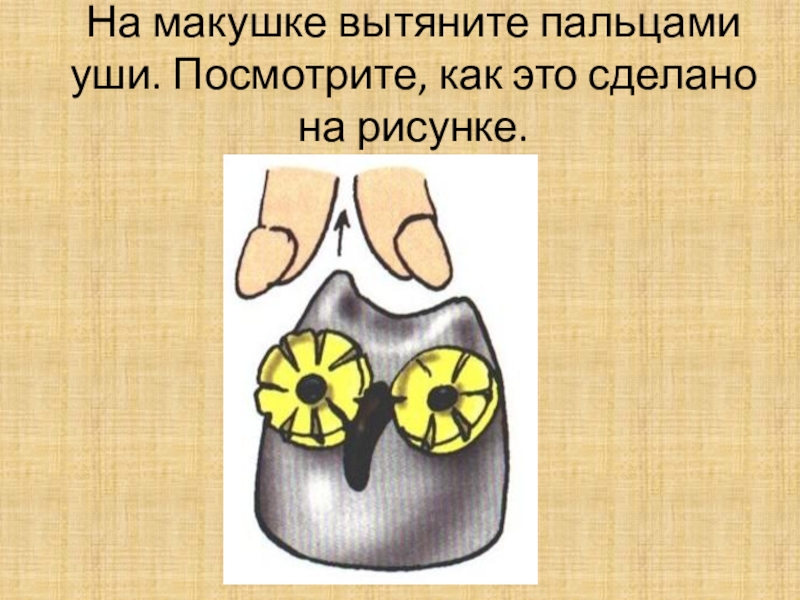 Слайд 7На макушке вытяните пальцами уши. Посмотрите, как это сделано на рисунке.
