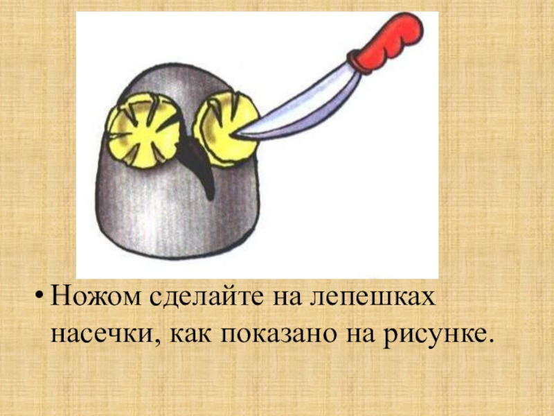 Слайд 5Ножом сделайте на лепешках насечки, как показано на рисунке.