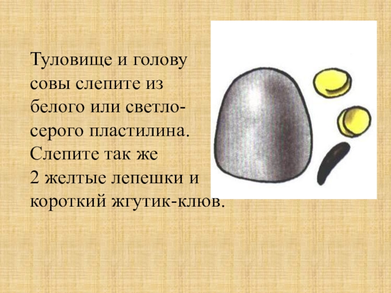 Туловище и головусовы слепите избелого или светло-серого пластилина.Слепите так же 2 желтые лепешки и короткий жгутик-клюв.