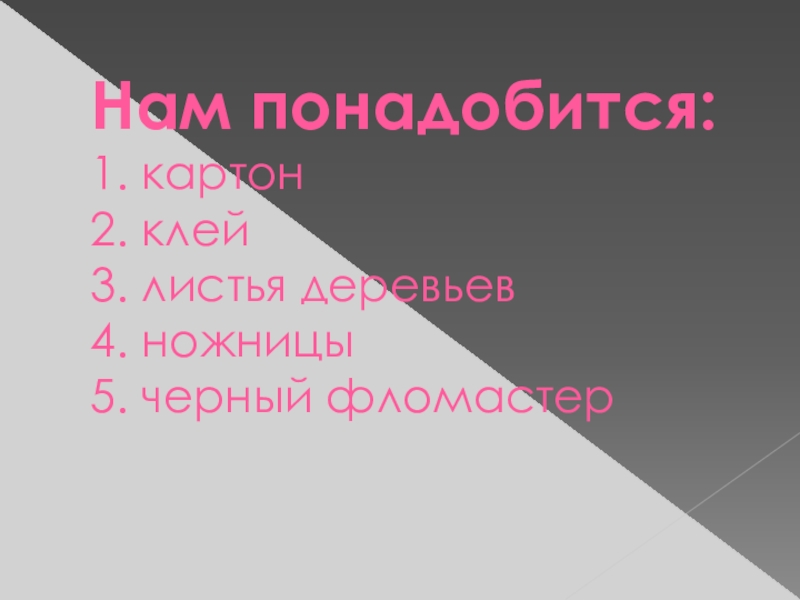 Слайд 2Нам понадобится: 1. картон 2. клей 3. листья деревьев 4. ножницы 5. черный фломастер