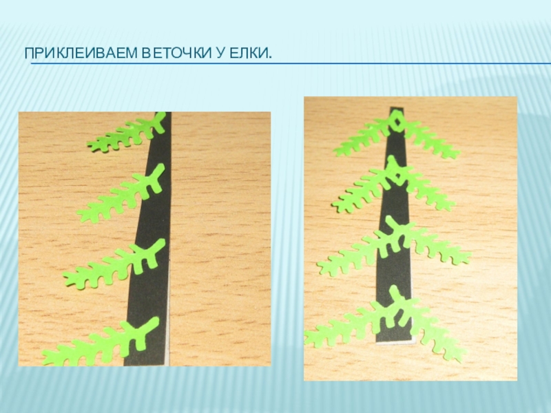 Слайд 4Приклеиваем веточки у елки.