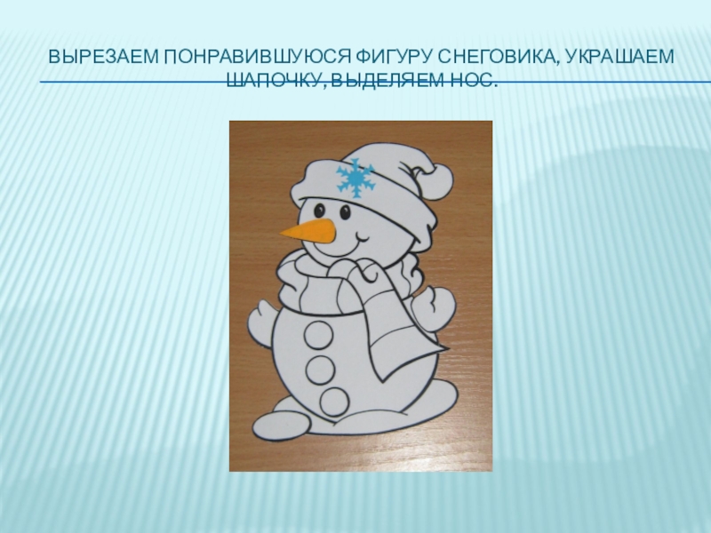 Слайд 7Вырезаем понравившуюся фигуру снеговика, украшаем шапочку, выделяем нос.
