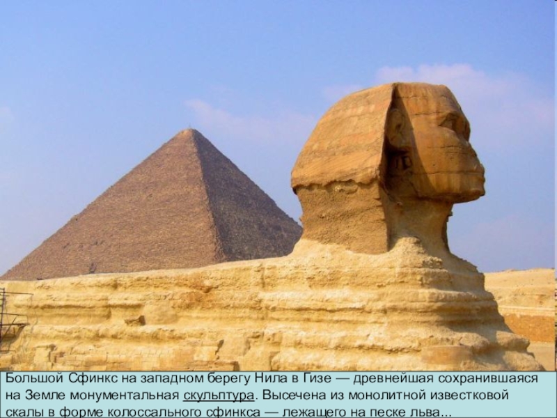 Большой Сфинкс на западном берегу Нила в Гизе — древнейшая сохранившаяся на Земле монументальная скульптура. Высечена из монолитной известковой скалы в форме колоссального сфинкса — лежащего на песке льва...