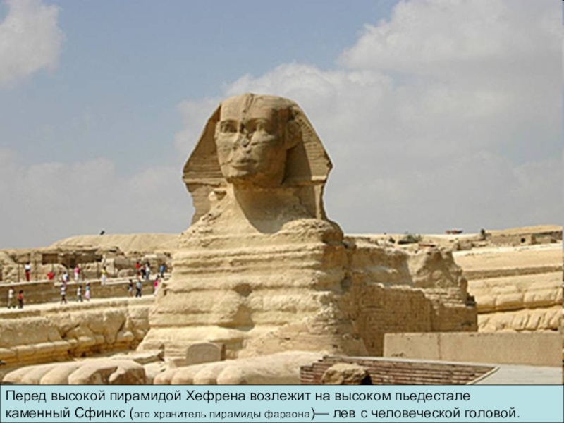 каменный Сфинкс (это хранитель пирамиды фараона)— лев с человеческой головой.