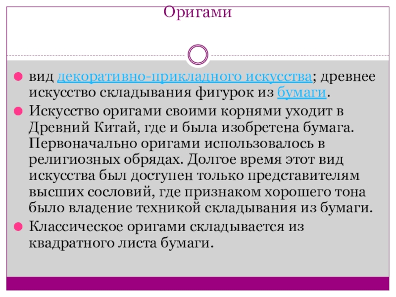 вид декоративно-прикладного искусства; древнее искусство складывания фигурок из бумаги.