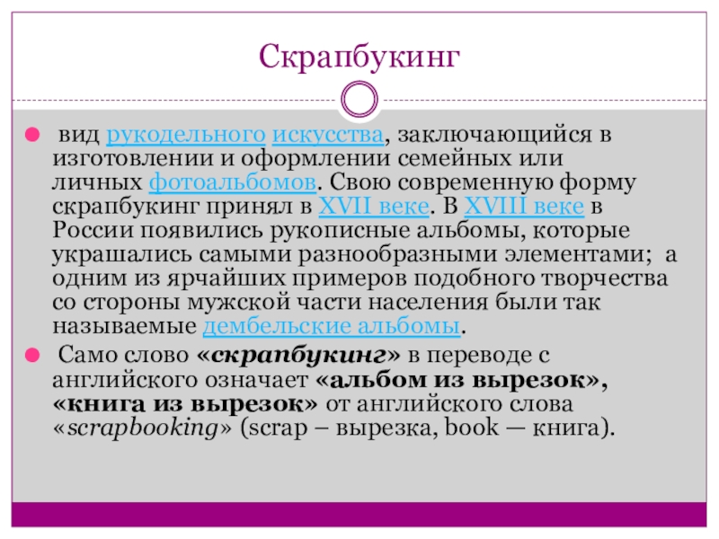вид рукодельного искусства, заключающийся в изготовлении и оформлении семейных или личных фотоальбомов. Свою современную