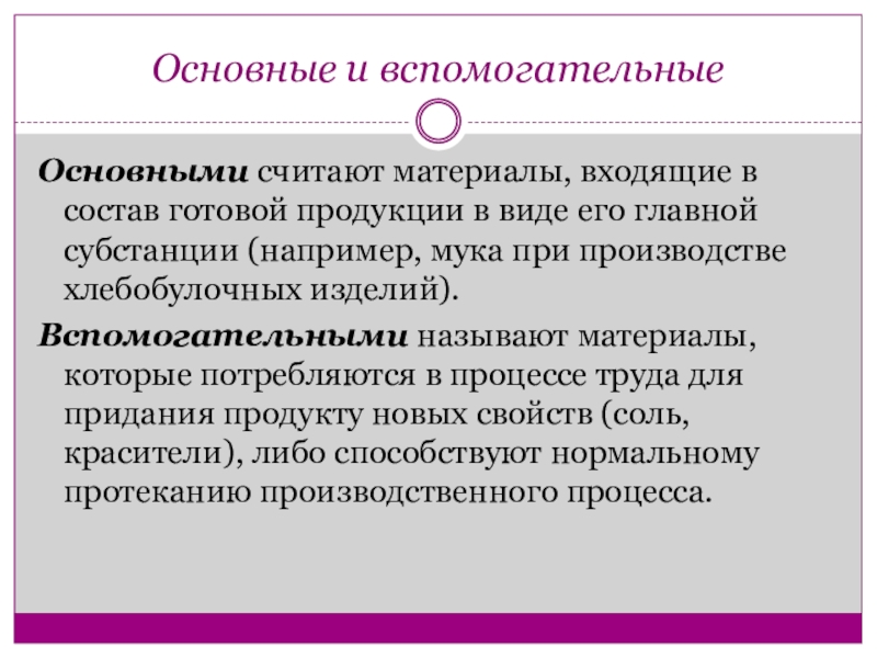 Вспомогательными называют материалы, которые потребляются в процессе труда для придания продукту новых свойств (соль, красители), либо способствуют нормальному протеканию производственного процесса.
