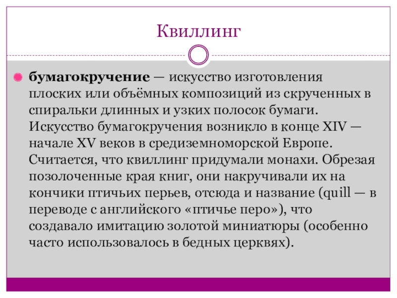 длинных и узких полосок бумаги. Искусство бумагокручения возникло в конце XIV — начале XV веков в средиземноморской Европе. Считается, что квиллинг придумали монахи. Обрезая позолоченные края книг, они накручивали их на кончики птичьих перьев, отсюда и название (quill — в переводе с английского «птичье перо»), что создавало имитацию золотой миниатюры (особенно часто использовалось в бедных церквях).