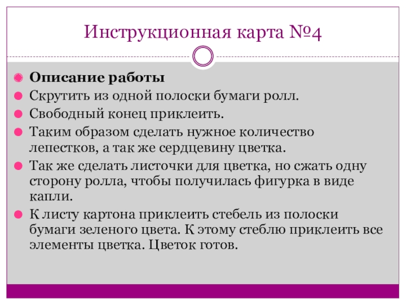 К листу картона приклеить стебель из полоски бумаги зеленого цвета. К этому стеблю приклеить все элементы цветка. Цветок готов.