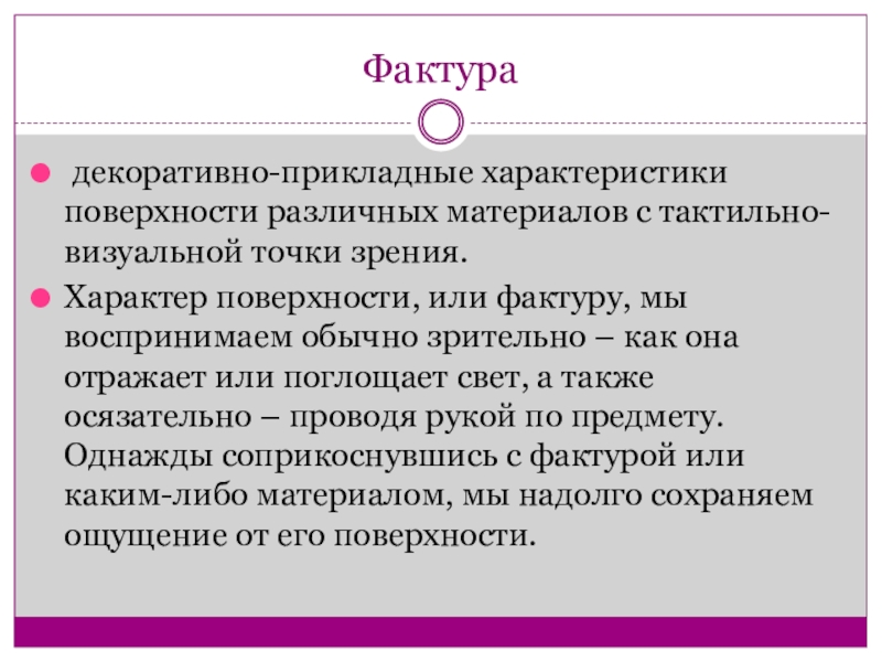 фактуру, мы воспринимаем обычно зрительно – как она отражает или поглощает свет, а также осязательно – проводя рукой по предмету. Однажды соприкоснувшись с фактурой или каким-либо материалом, мы надолго сохраняем ощущение от его поверхности.