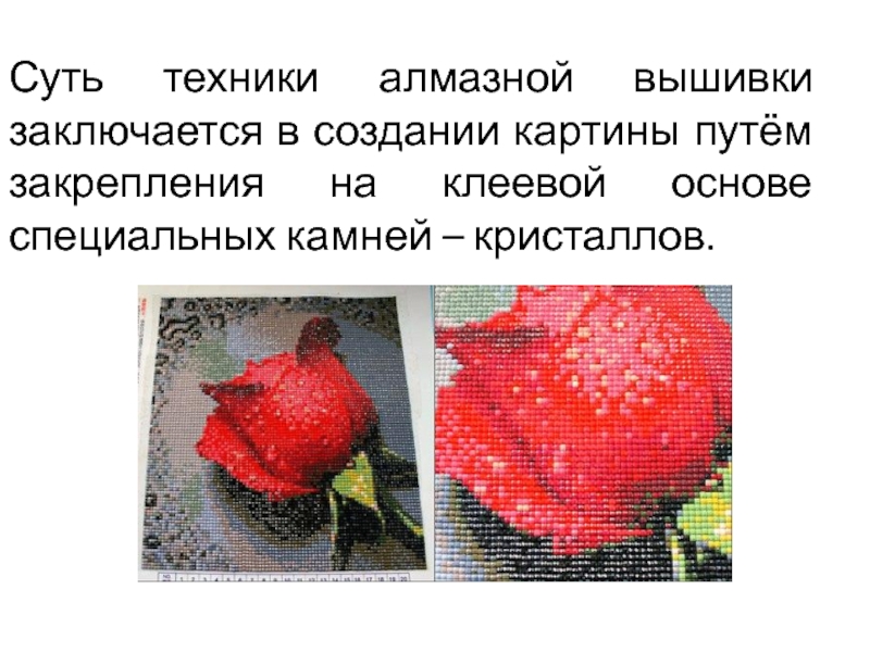 Слайд 3Суть техники алмазной вышивки заключается в создании картины путём закрепления на