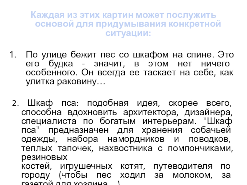 Каждая из этих картин может послужить основой для придумывания конкретной ситуации:По улице бежит пес со шкафом на