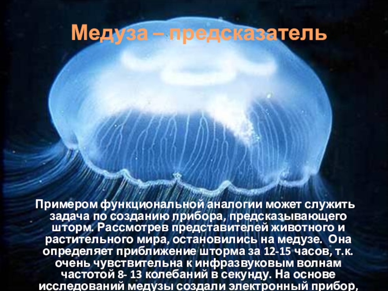 Медуза – предсказатель  Примером функциональной аналогии может служить задача по созданию прибора, предсказывающего шторм. Рассмотрев представителей
