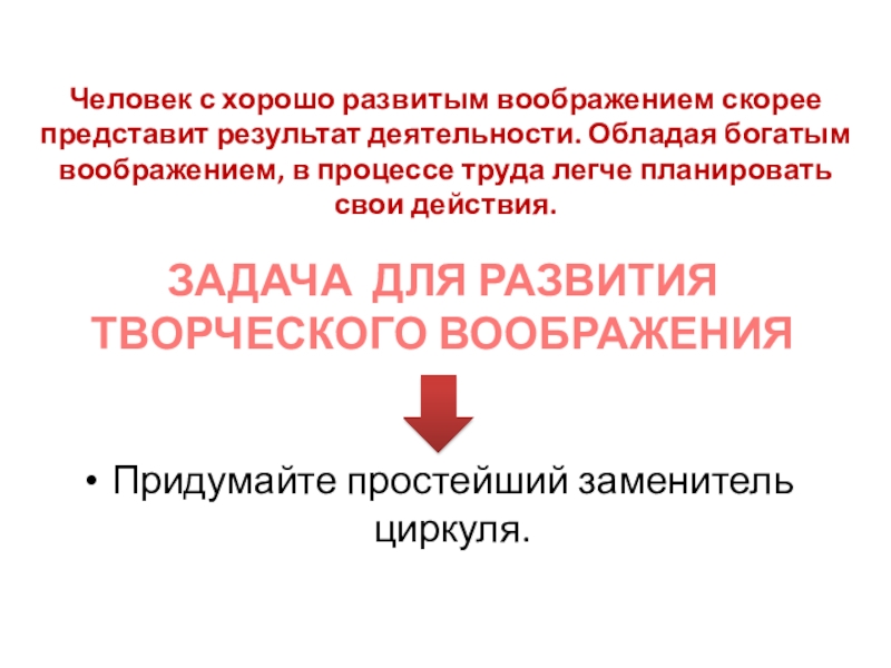 ЗАДАЧА ДЛЯ РАЗВИТИЯ ТВОРЧЕСКОГО ВООБРАЖЕНИЯПридумайте простейший заменитель циркуля.Человек с хорошо развитым воображением скорее представит результат деятельности. Обладая богатым воображением, в процессе труда легче планировать свои действия.