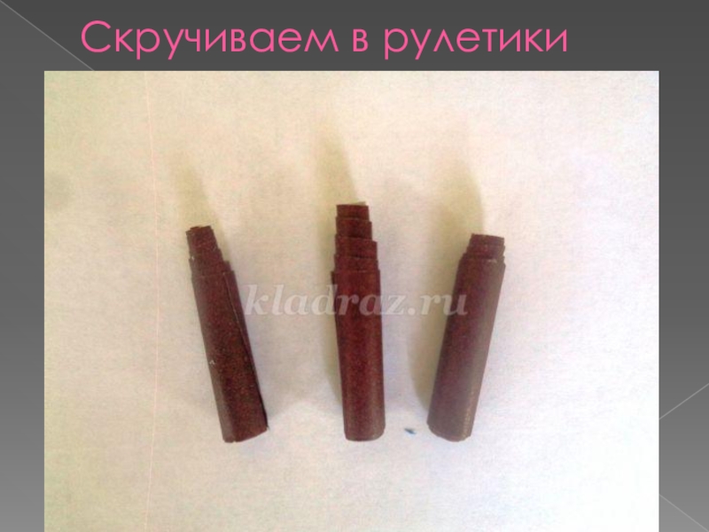 Слайд 8Вырезаем тоненькие полосочки, закрутив их на карандаше приклеиваем перед петельками