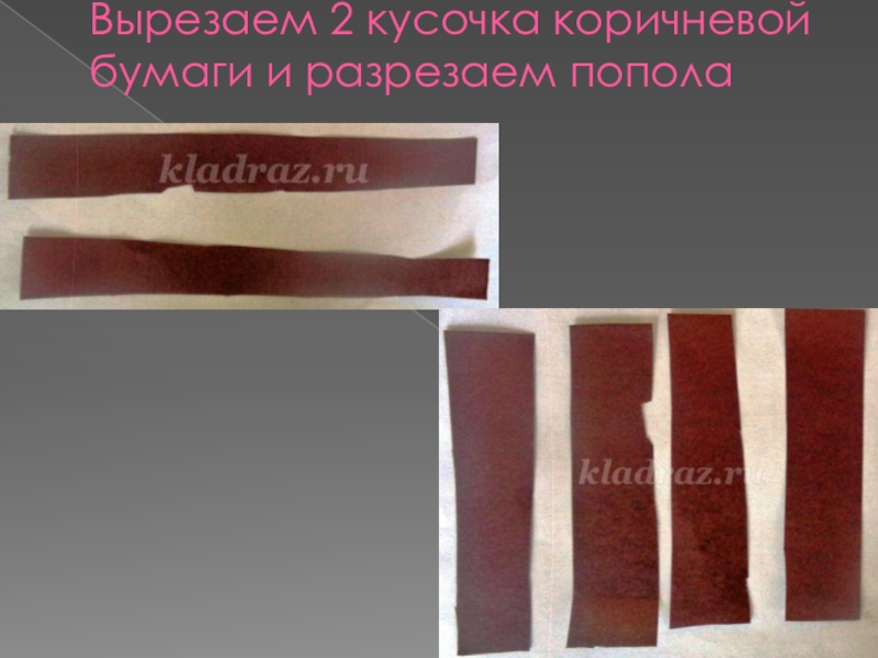 Слайд 21Вырезаем 2 кусочка коричневой бумаги и разрезаем попола