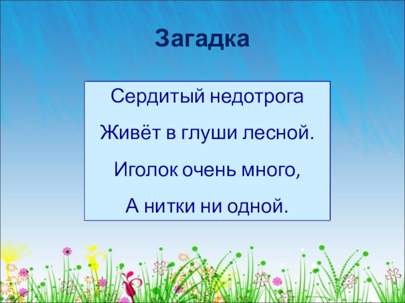 ЗагадкаСердитый недотрогаЖивёт в глуши лесной.Иголок очень много,А нитки ни одной.