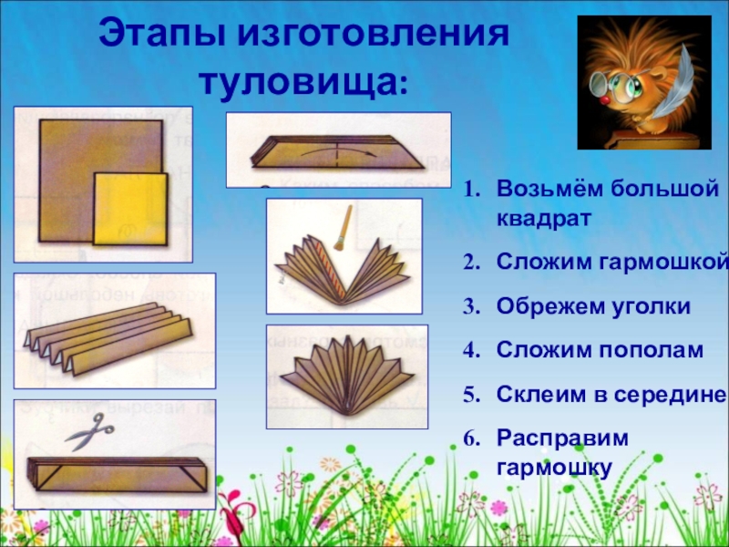 Этапы изготовления туловища:Возьмём большой квадратСложим гармошкойОбрежем уголкиСложим пополамСклеим в серединеРасправим гармошку