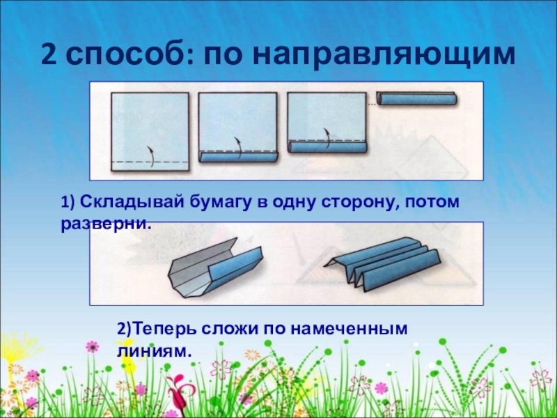 2 способ: по направляющим1) Складывай бумагу в одну сторону, потом разверни.2)Теперь сложи по намеченным линиям.