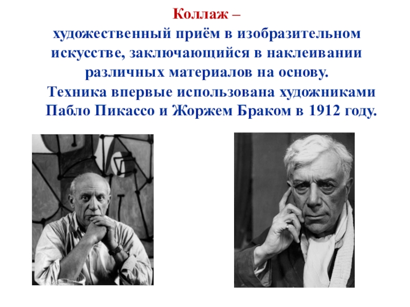 Техника впервые использована художниками Пабло Пикассо и Жоржем Браком в 1912 году.