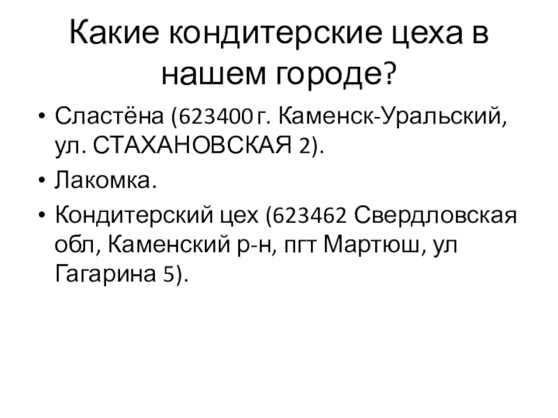 Слайд 7Какие кондитерские цеха в нашем городе?