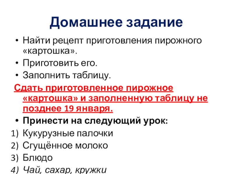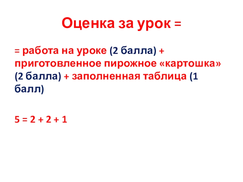 пирожное «картошка» (2 балла) + заполненная таблица (1 балл)
