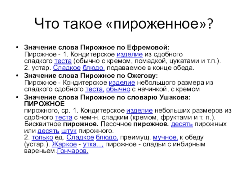 Пирожное - Кондитерское изделие небольшого размера из сладкого сдобного теста, обычно с начинкой, с кремом