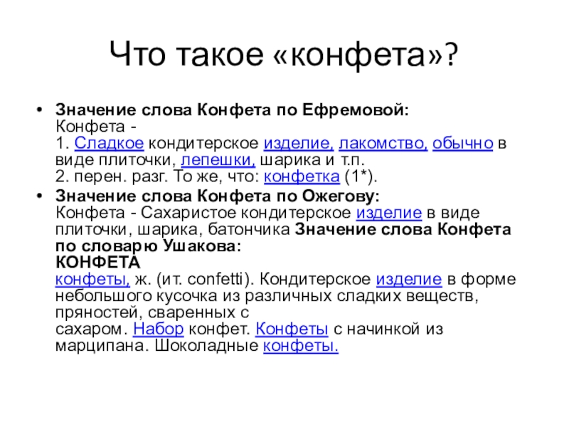 Конфета - Сахаристое кондитерское изделие в виде плиточки, шарика, батончика Значение слова Конфета по словарю Ушакова: