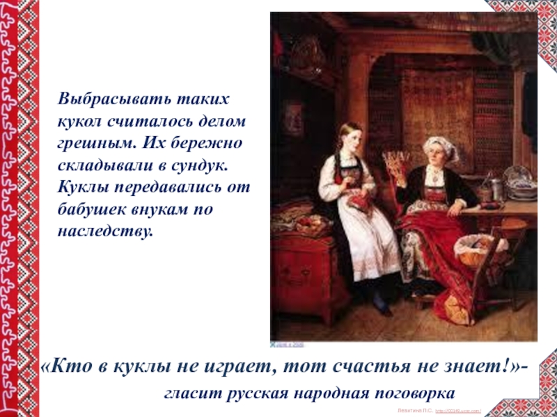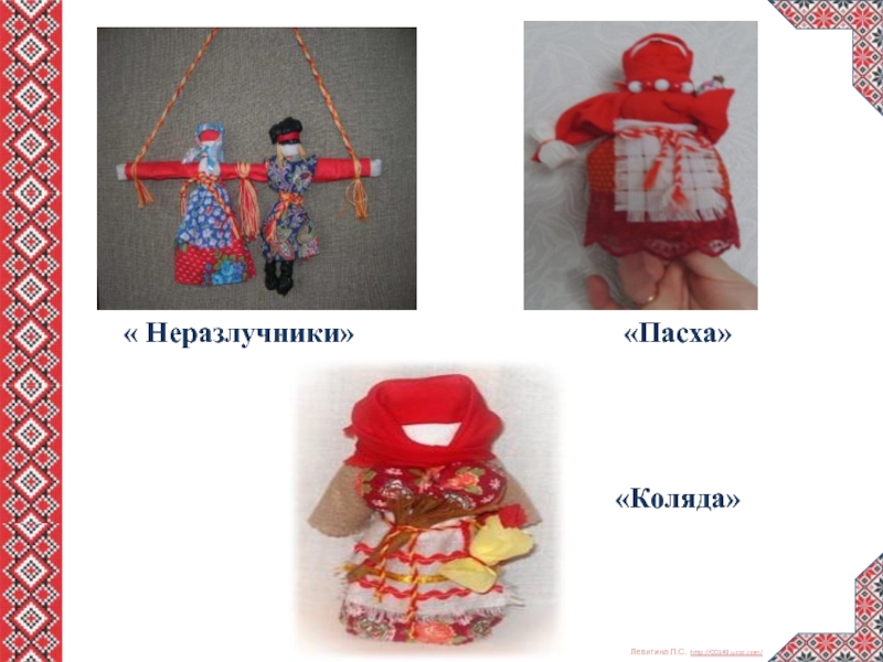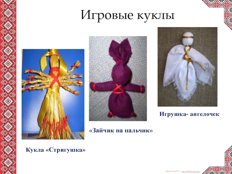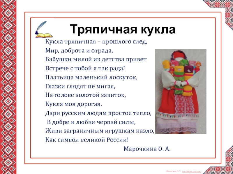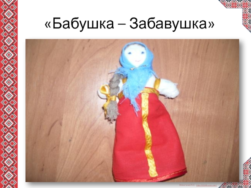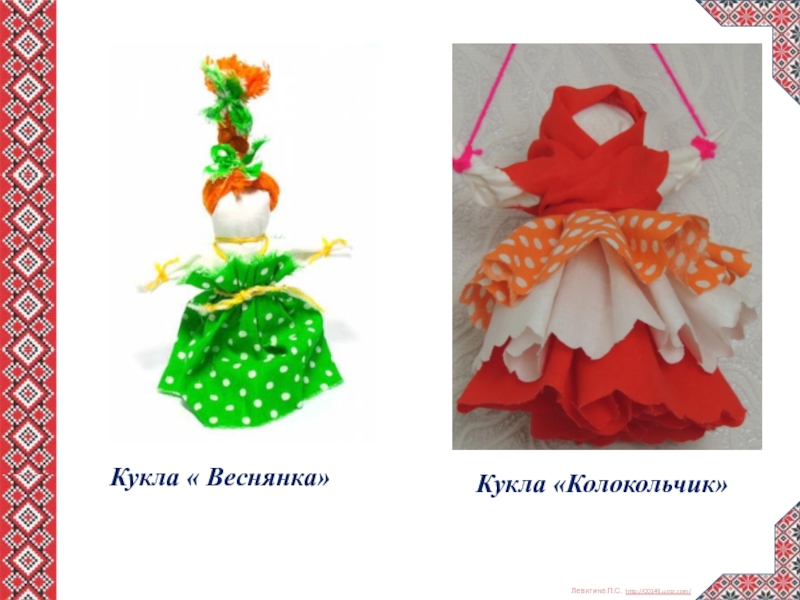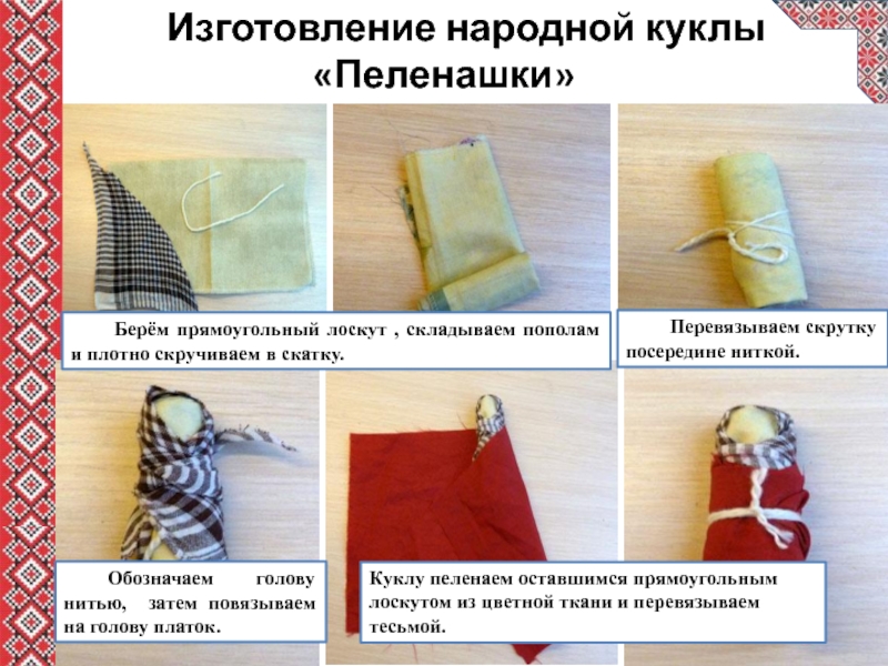 Куклу пеленаем оставшимся прямоугольным лоскутом из цветной ткани и перевязываем тесьмой.