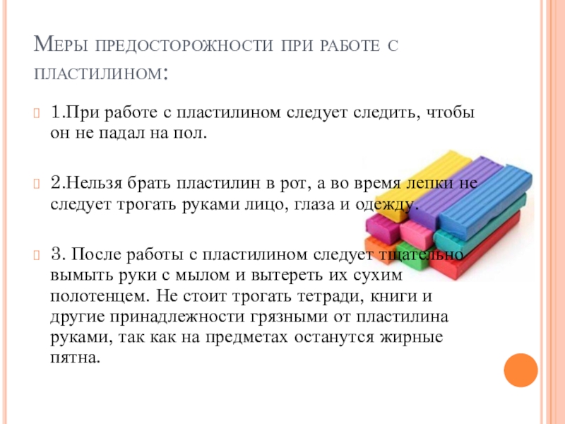 Меры предосторожности при работе с пластилином:1.При работе с пластилином следует следить, чтобы он не падал на пол.2.Нельзя брать пластилин в рот, а во время лепки не следует трогать руками лицо, глаза и одежду.3. После работы с