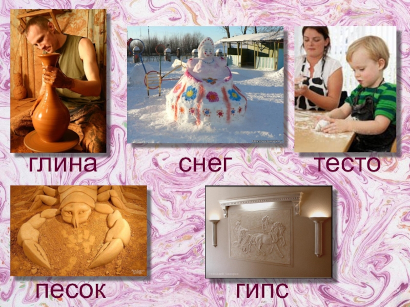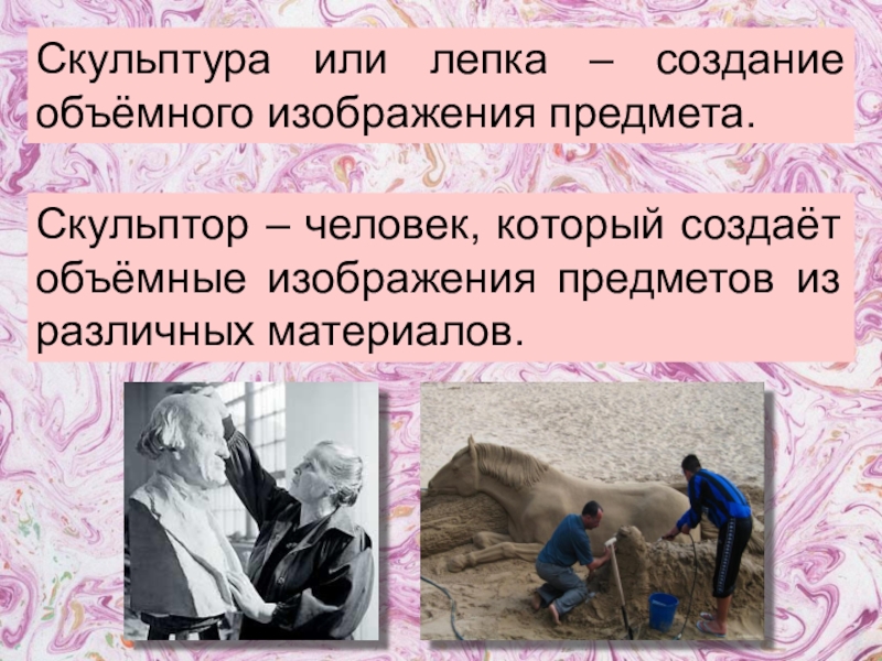 Скульптура или лепка – создание объёмного изображения предмета.Скульптор – человек, который создаёт объёмные изображения предметов из различных