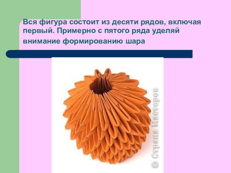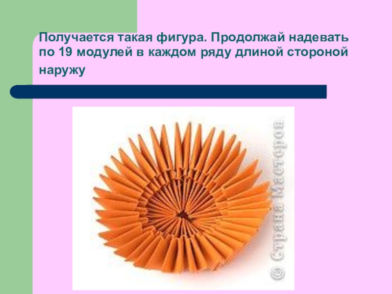 Слайд 10Получается такая фигура. Продолжай надевать по 19 модулей в каждом ряду длиной стороной наружу