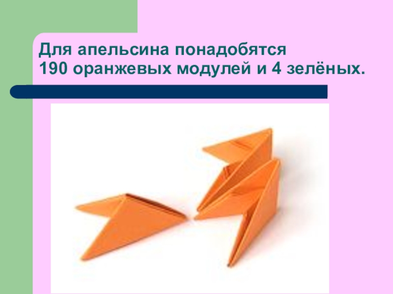 Слайд 8Для апельсина понадобятся 190 оранжевых модулей и 4 зелёных.