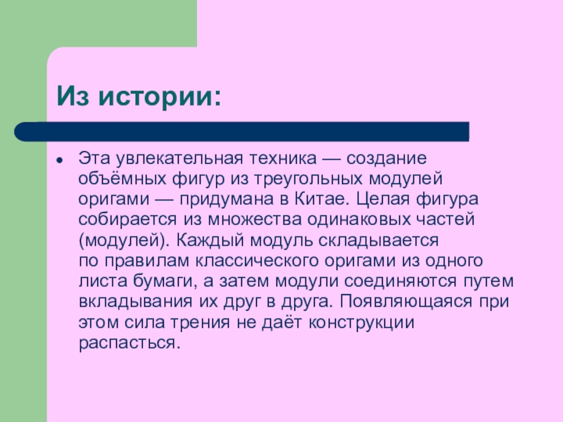 Из истории:Эта увлекательная техника — создание объёмных фигур из треугольных модулей оригами — придумана в Китае. Целая фигура собирается