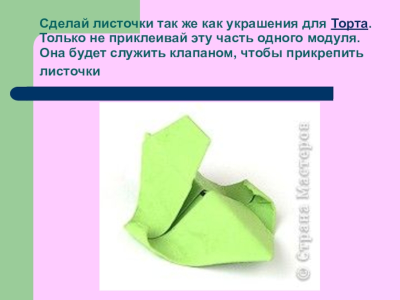 Слайд 16Сделай листочки так же как украшения для Торта. Только не приклеивай эту часть