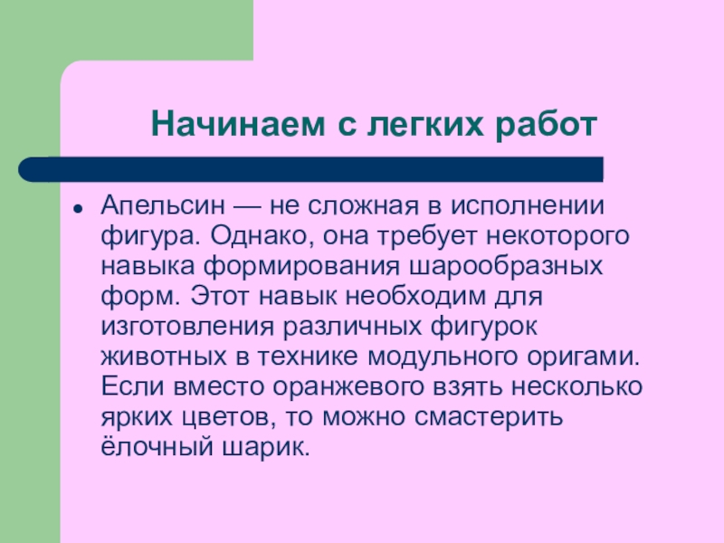 навыка формирования шарообразных форм. Этот навык необходим для изготовления различных фигурок животных в технике модульного оригами. Если вместо оранжевого взять несколько ярких цветов, то можно смастерить ёлочный шарик.