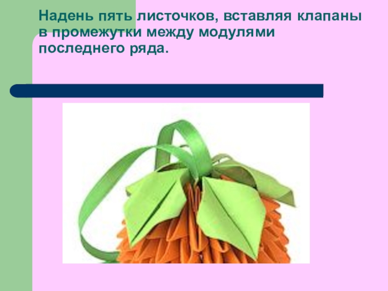 Слайд 17 Надень пять листочков, вставляя клапаны в промежутки между модулями последнего ряда.