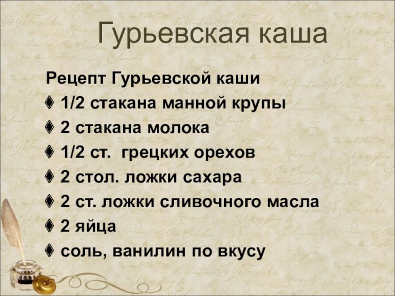 Гурьевская кашаРецепт Гурьевской каши1/2 стакана манной крупы2 стакана молока1/2 ст. грецких орехов2 стол. ложки сахара2 ст. ложки