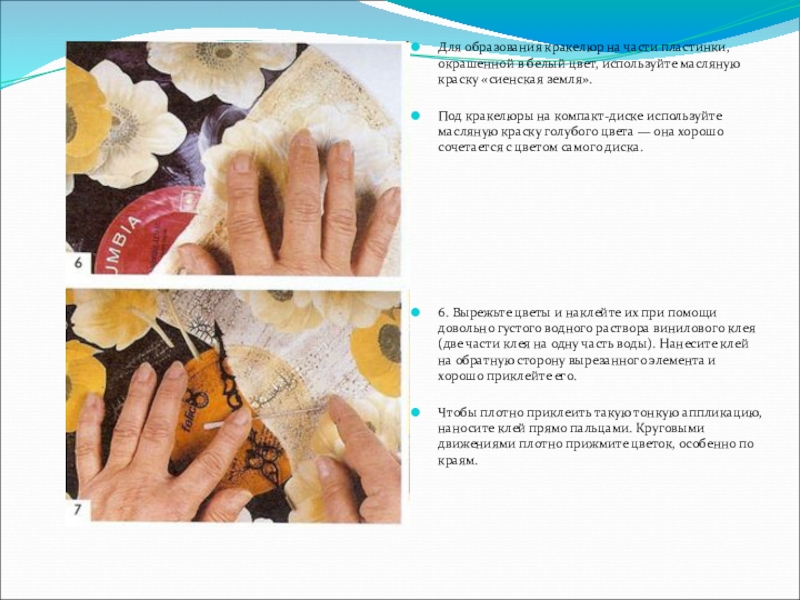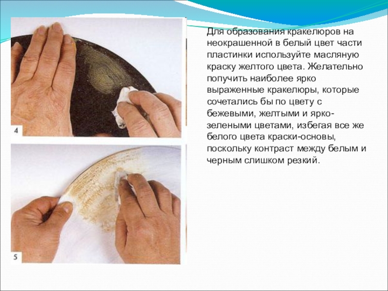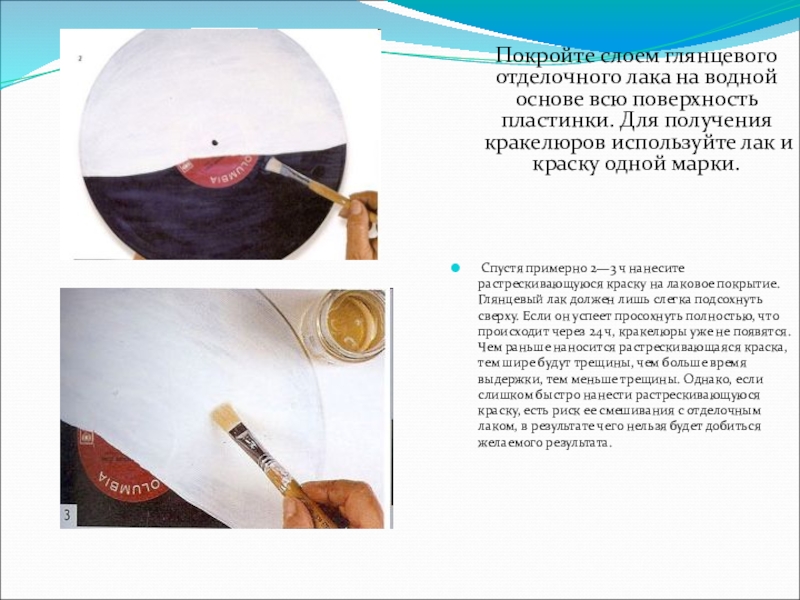 Спустя примерно 2—3 ч нанесите растрескивающуюся краску на лаковое покрытие. Глянцевый лак должен лишь слегка подсохнуть сверху. Если он успеет просохнуть полностью, что происходит через 24 ч, кракелюры уже не появятся. Чем раньше наносится растрескивающаяся краска, тем шире будут трещины, чем больше время выдержки, тем меньше трещины. Однако, если слишком быстро нанести растрескивающуюся краску, есть риск ее смешивания с отделочным лаком, в результате чего нельзя будет добиться желаемого результата.