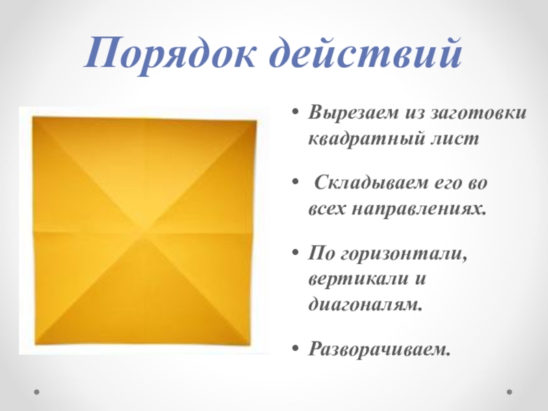 Порядок действийВырезаем из заготовки квадратный лист Складываем его во всех направлениях. По горизонтали, вертикали и диагоналям.Разворачиваем.