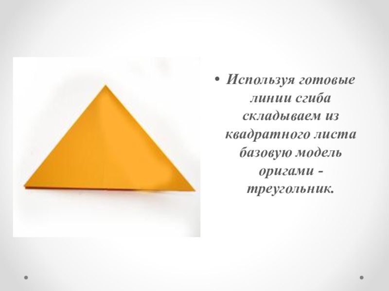 Используя готовые линии сгиба складываем из квадратного листа базовую модель оригами - треугольник.
