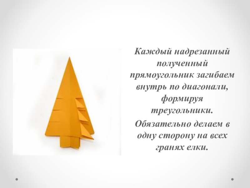 Слайд 10Каждый надрезанный полученный прямоугольник загибаем внутрь по диагонали, формируя треугольники.