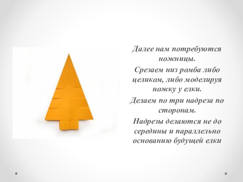 Далее нам потребуются ножницы. Срезаем низ ромба либо целиком, либо моделируя ножку у елки. Делаем по три