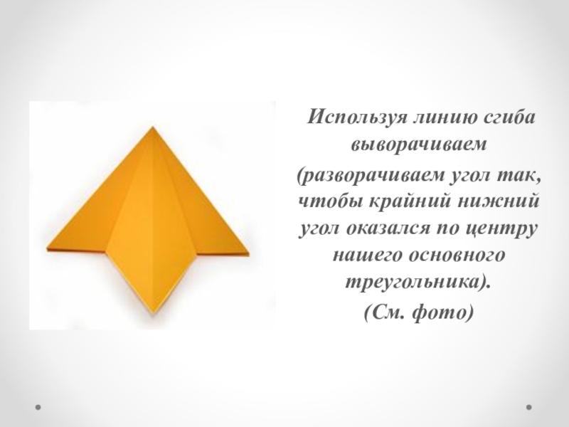 Используя линию сгиба выворачиваем(разворачиваем угол так, чтобы крайний нижний угол оказался по центру нашего основного треугольника).
