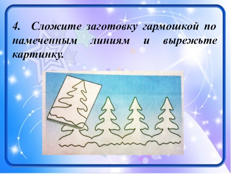 Слайд 104. Сложите заготовку гармошкой по намеченным линиям и вырежьте картинку.