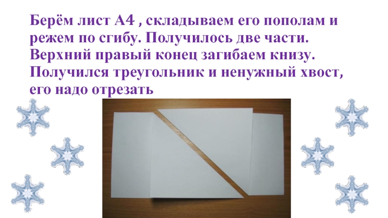 Слайд 4 Берём лист А4 , складываем его пополам и режем по сгибу.