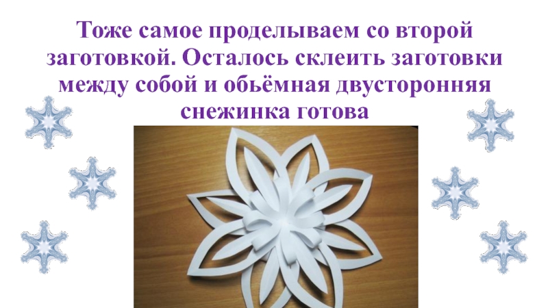 Тоже самое проделываем со второй заготовкой. Осталось склеить заготовки между собой и обьёмная двусторонняя снежинка готова