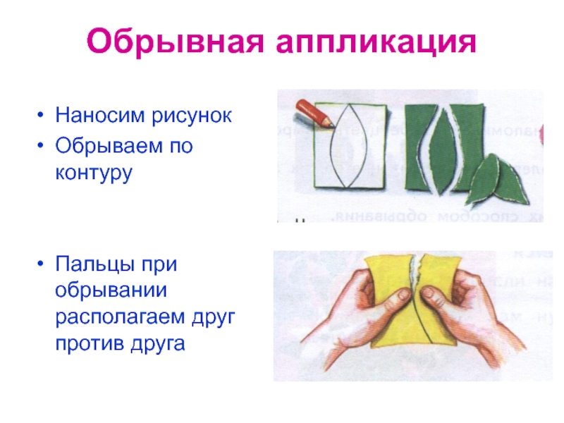 Обрывная аппликацияНаносим рисунокОбрываем по контуруПальцы при обрывании располагаем друг против друга